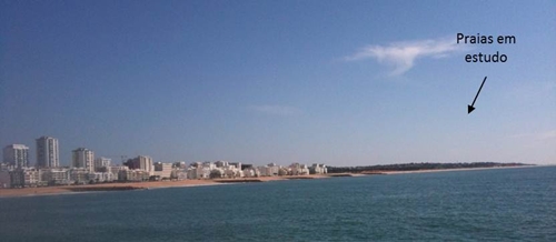Figura 4: Esporões De Quarteira e praias em estudo a leste. Forte erosão costeira no troço Forte Novo – Vale do Garrão e nas praias a este dos esporões. O turismo é afetado uma vez que as areias são retiradas pelo mar, o que leva a uma diminuição da área balnear. As habitações construídas por cima das arribas podem desabar caso o mar chegue a elas e haja abrasão marinha. Os restaurantes das praias podem ser inundados o que leva a uma destruição dos seus recheios. Futuras Se a crescente erosão continuar é de esperar que a costa litoral recue e as praias desapareçam. O turismo algarvio diminuirá, o que afetará o comércio local, levando ao fecho de estabelecimentos e consequentes despedimentos. As arribas sob as quais estão construídas várias infraestruturas também poderão abater por falta de suporte, deitando por terra vários milhões de euros investidos nessas zonas. De modo a corrigir a diminuição das áreas balneares e a transgressão marinha recorre-se à alimentação das praias com areias do fundo do mar, este não só é o método mais barato, como o mais rápido, mas neste caso, os seus resultados não foram úteis a longo prazo. A preia de Vale do Lobo foi alimentada entre 1998 e 1999, tendo aumentado a distância entre o mar e as arribas em 60 metros (figura 5A e 6) e dois anos depois esta distância era apenas de 20 metros (figura 5B E 6).