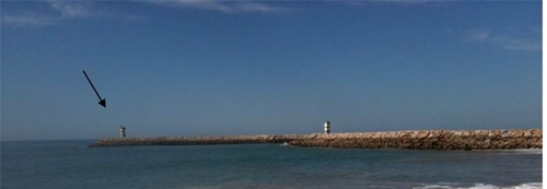 Figura 7: O farol a que o pescador se referia quando disse que a praia chegava ao farol vermelho (assinalado pela seta). Conclusão Este estudo de caso permitiu-nos compreender a importância do ordenamento de território para a gestão da interação homem com o espaço natural. Este planeamento tem que ser pensado compreendendo a estrutura das ocupações humanas e ainda a dinâmica da natureza, de modo a evitar desastres quer a nível material como pessoal e custos desnecessários com obras de engenharia para proteger o que está construídos, muitas vezes no local errado. Analisando concretamente a zona do troço Forte Novo – Garrão e a praia de Quarteira, foi possível descobrir quais as causas da visível regressão dessa costa e ainda perceber quais as consequências da mesma. Através da entrevista pudemos ter uma perceção da dimensão das alterações não só no troço estudado como da praia de Quarteira. Bibliografia Notícia: http://www.jn.pt/Dossies/dossie.aspx?content_id=1647202&dossier=Radiografia%20da%20costa%20portuguesa&page=1 Estudo/ tese: http://w3.ualg.pt/~jdias/JAD/papers/CI/05_3ZCPEP_Maputo_SO.pdf http://enggeografica.fc.ul.pt/documentos/tese_sergio_oliveira.pdf