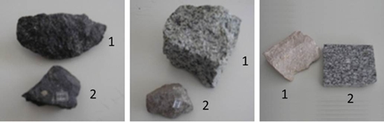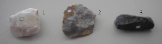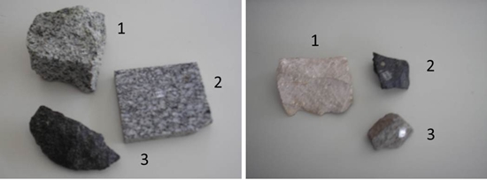Figura 6. Mármore (1), quartzito (2), corneana (3), rochas resultantes de um metamorfismo de contacto. Como a temperatura é o principal factor neste tipo de metamorfismo, as rochas não apresentam foliação. A rocha 1 é resultado do metamorfismo que actuou sobre um calcário, a 2 teve origem num arenito quartezítico e a rocha 3 é obtida através da alteração de rochas argilosas. O metamorfismo regional actua em extensas áreas, normalmente ao longo dos limites tectónicos convergentes, desta forma, está relacionado com os processos orogénicos. Este tipo de metamorfismo resulta da acção combinada do calor, das tensões dirigidas e fluidos de circulação. Como a pressão não litostática é o principal factor de metamorfismo, estas rochas apresentam uma foliação evidente.