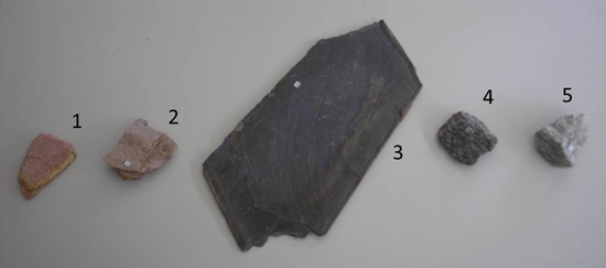 Figura 7. Xisto argiloso (1), filito (2), xisto (3), micaxisto (4) e gnaisse (5), rochas resultantes de um metamorfismo regional. Como a tensão dirigida se faz sentir, fortemente, neste tipo de metamorfismo todas as rochas apresentam foliação evidente. As rochas 1, 2 e 3 apresentam uma clivagem xistenta por resultarem de um grau baixo de metamorfismo. A rocha 4 apresenta xistosidade e está associada a um grau médio de metamorfismo, enquanto a rocha 5 possui bandado gnáissico resultante de um metamorfismo intenso. Outros Trabalhos Relacionados