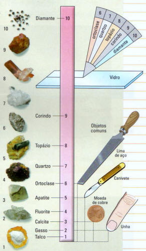 Objectivos A experiência a seguir relatada teve como objetivos: . Verificar as diferenças entre a cor de um mineral e a risca que este produz. Introdução Mineral é um corpo natural sólido e cristalino formado em resultado da interação de processos físico-químicos em ambientes geológicos. Cada mineral é classificado e denominado não apenas com base na sua composição química, mas também na estrutura cristalina dos materiais que o compõem. Em resultado dessa distinção, materiais com a mesma composição química podem constituir minerais totalmente distintos em resultado de meras diferenças estruturais na forma como os seus átomos ou moléculas se arranjam espacialmente (como por exemplo a grafite e o diamante. Os minerais variam na sua composição desde elementos químicos, em estado puro ou quase puro, e sais simples a silicatos complexos com milhares de formas conhecidas. Embora em sentido estrito o petróleo, o gás natural e outros compostos orgânicos formados em ambientes geológicos sejam minerais, geralmente a maioria dos compostos orgânicos é excluída. Também são excluídas as substâncias, mesmo que idênticas em composição e estrutura a algum mineral, produzidas pela atividade humana (como por exemplos os betões ou os diamantes artificiais). Propriedades físicas As propriedades físicas dos minerais resultam da sua composição química e das suas características estruturais.As propriedades físicas mais óbvias e mais facilmente comparáveis são as mais utilizadas na identificação de um mineral. Na maioria das vezes, essas propriedades, e a utilização de tabelas adequadas, são suficientes para uma correta identificação. Quando não, tal não é possível, ou quando um elevado grau de ambiguidade persiste, como no caso de muitos isomorfos similares, a identificação é realizada a partir da análise química, de estudos de ótica ao microscópio petrográfico ou por difração de raios X ou de neutrões. São as seguintes as propriedades físicas macroscópicas, observáveis sem necessidade de equipamento sofisticado (por vezes designadas, por essa razão, por propriedades de campo): . Cor — É uma característica extremamente importante dos minerais. Pode variar devido a impurezas existentes em minerais como o quartzo, o corindo, a fluorite, a calcite e a turmalina, entre outros. Noutros casos, a superfície do mineral pode estar alterada, não mostrando sua verdadeira cor. A origem da cor nos minerais está principalmente ligada à presença de iões metálicos, fenómenos de transferência de carga e efeitos da radiação ionizante. Eis alguns exemplos: . Jade — esverdeado; . Augite — verde-escuro a preto; . Cassiterite — verde a castanho; . Pirite — amarelo-ouro. . Brilho — O brilho depende da absorção, refração ou reflexão da luz pelas superfícies frescas de fratura do mineral (ou as faces dos seus cristais ou as superfícies de clivagem). O brilho é avaliado à vista desarmada e descrito em termos comparativos utilizando um conjunto de termos padronizados. Os brilhos são em geral agrupados em: metálico e não metálico ou vulgar. Diz-se que o brilho é não metálico, ou vulgar, quando não é semelhante aos dos metais, sendo característico dos minerais transparentes ou translúcidos. Dentro das grandes classes atrás apontadas, o brilho de um mineral pode ser descrito como: . Brilhos não metálicos . Acetinado — brilho não metálico que faz lembrar o brilho do cetim; é característico dos minerais fibrosos; . Adamantino — brilho não metálico que, pelas suas características, nomeadamente a intensidade, se assemelha ao do diamante (são exemplos a pirargirite e a cerusite; . Ceroso — brilho não metálico que lembra o da cera (é exemplo a variscite); Nacarado — brilho não metálico semelhante ao das pérolas (é exemplo a caulinite); . Resinoso — brilho não metálico que lembra o observado nas superfícies de fartura das resinas (é exemplo a monazite); . Vítreo — brilho não metálico que lembra o do vidro (são exemplos a fluorite, a halite e a aragonite); . Brilhos metálicos: . Metálico — brilho que se assemelha ao dos metais, sendo característico de minerais opacos como a galena, a calcopirite e a pirite; . Submetálico — brilho que faz lembrar o dos metais, mas não tão intenso, sendo característico dos minerais quase opacos como a cromite. . Traço ou Risca — A cor do traço de um mineral pode ser observada quando uma louça ou porcelana branca é riscada. A clorite, a gipsite (gesso) e o talco deixam um traço branco, enquanto o zircão, a granada e a estaurolite deixam, comummente, um traço castanho avermelhado. O traço de um mineral fornece uma importante característica para sua identificação, já que permite diferenciar materiais com cores e brilhos similares. Propriedades mecânicas . Clivagem — É a forma como muitos minerais se quebram seguindo planos relacionados com a estrutura molecular interna, paralelos às possíveis faces do cristal que formariam. A clivagem é descrita em cinco modalidades: desde pobre, como na bornite; moderada; boa; perfeita; e proeminente, como nas micas. Os tipos de clivagem são descritos pelo número e direção dos planos de clivagem. . Fratura — Refere-se à maneira pela qual um mineral se parte, exceto quando ela é controlada pelas propriedades de clivagem e partição. O estilo de fracturação é um elemento importante na identificação do mineral. Alguns minerais apresentam estilos de fracturação muito característicos, determinantes na sua identificação. . Dureza — Expressa a resistência de um mineral à abrasão ou ao risco. Ela reflete a força de ligação dos átomos, iões ou moléculas que formam a estrutura. A escala de dureza mais frequentemente utilizada, apesar da variação da dureza nela não ser gradativa ou proporcional, é a escala de Mohs.  Fig. 1 – Escala de Mohs Densidade — É a medição 