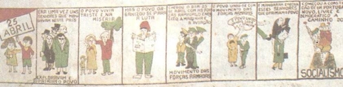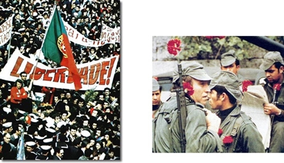 Pintura mural da Rua de Branca Martinho “25 de Abril | Era uma vez uns senhores que mandavam neste país – exploravam e oprimiam o povo | O povo vivia triste e na miséria | Mas o povo organizou-se para a luta | Chegou o dia 25 de Abril com as forças armadas, o exército, a marinha e a aviação – Movimento das Forças Armadas | O povo uniu-se com o Movimento das Forças Armadas – O povo unido jamais será vencido | E mandaram embora esses senhores que oprimiam o povo | Chegou a construção de um Portugal novo, livre e democrático, a caminho do Socialismo”. Depois da Revolução Iniciava-se, então nesse dia, a 2ª República. Foi constituída uma Junta de Salvação Nacional, que, no dia seguinte ao da Revolução, deu a conhecer ao povo português, através da rádio e da televisão, o programa do MFA. Foram tomadas medidas imediatas para democratizar o país: . Extinção da policia politica PIDE/DGS, da Legião Portuguesa e da Mocidade Portuguesa. . Libertação dos presos políticos. . Fim da censura prévia. . Autorização das actividades partidárias e sindicais. Os exilados políticos começaram a regressar ao país – Mário Soares, Álvaro Cunhal e Francisco Sá Carneiro, que se integraram no Governo Provisório. Uma semana depois, festejava-se, em plena liberdade e com grande entusiasmo, o 1º de Maio – Dia do Trabalhador. Segundo o programa do Movimento das Forças Armadas, a restauração da democracia em Portugal exigia que o país concedesse a independência às suas colónias. Nesse sentido, iniciaram-se contactos com os vários movimentos que, até aí, tinham lutado contra as forças militares portuguesas, para se negociar o processo que conduziria à independência. Em Julho de 1974, o General António de Spínola, então Presidente da República, iniciou a descolonização, através de negociações com os representantes das colónias. Graças a este reconhecimento da independência das colónias, milhares de portugueses retornaram ao país (vulgarmente chamados de “retornados”). Pouco depois da revolução, criaram-se os seguintes partidos: . Partido Comunista Português (PCP) – que apesar de ter sobrevivido à ditadura, existindo ilegalmente entre o país, apenas veio a público após a revolução. Graças à sua sobrevivência, era o mais organizado e o mais activo, sendo liderado por Álvaro Cunhal. . Partido Socialista (PS) – fundado em 1973, no estrangeiro, por um grupo de democratas, entre os quais, Mário Soares. . Partido Social-Democrata (PSD) – primeiramente chamado de Partido Popular Democrático (PPD), e onde entre os seus fundadores se encontrava Francisco Sá Carneiro. . Centro Democrático Social (CDS) – cujo primeiro secretário-geral foi Diogo Freitas do Amaral. A 25 de Abril de 1975 foram realizadas as primeiras eleições livres, em 50 anos, para a escolha dos deputados à Assembleia Constituinte. Mas Portugal encontrava-se ainda numa grande instabilidade revolucionária. Os novos governos, comunistas, não satisfaziam a necessidade de democracia da população. Por isso, a 25 de Novembro de 1975, um novo levantamento militar pôs fim aos extremos da esquerda. O regime democrático foi imposto, principalmente, através da Constituição de 1976, onde se consagraram as liberdades individuais e colectivas, assim como o sufrágio universal e a livre alternância das forças políticas no poder. Também com a Constituição, as forças foram distribuídas da seguinte forma: . Poder Executivo – pertence ao Presidente da República, eleito por sufrágio universal, e ao Governo por ele nomeado, de acordo com os resultados das eleições legislativas; . Poder Legislativo – cabe à Assembleia da República, também eleita por sufrágio universal; . Poder Judicial – compete aos Tribunais, constituídos por magistrados independentes. . Conselho da Revolução – posteriormente extinto, e no lugar do qual foi criado o Tribunal Constitucional, ao qual compete a função de zelar pelo cumprimento da Constituição. A constituição estabeleceu também o poder local, que atribuiu às autarquias. Criou também a Região Autónoma dos Açores e a Região Autónoma da Madeira, com estatutos político-administrativos próprios. Mas, após o 25 de Abril, apesar das inúmeras melhoras, Portugal atravessou graves crises económicas, por ter um desenvolvimento retardado em relação aos outros países europeus. Devido a esse atraso, Portugal aderiu à Comunidade Económica Europeia (CEE), o que permitiu ao país beneficiar da entrada de grandes fundos comunitários para a modernização do país. Hoje em dia, Portugal continua no espaço económico europeu, apesar de também sofrer com esse facto (cada vez mais países aderem à União Europeia, sendo que é exigido um maior esforço de solidariedade). Bibliografia: Livros “Conhece a tua História” de Bernardo Barrosa, Edições Nova Gaia 2004 “O caso do Espelho Armadilhado” de José Lança-Coelho, Dinalivro 2008 “História Nove – parte 2” de Maria Emília Diniz, Adérito Tavares e Arlindo M. Caldeira, Lisboa Editora 2010 Sites http://libertario08.files.wordpress.com/2009/04/25abril.jpg http://pt.wikipedia.org/wiki/Revolu%C3%A7%C3%A3o_dos_Cravos http://artesletras.wordpress.com/2009/04/25/25-de-abril-marcado-pelo-descontentamento-com-a-crise-e-a-descrenca-politica/