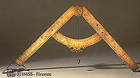 Fig.5 – Compasso geométrico militar 2. Termoscópio (fig.6) – Foi inventado 1592. Era composto por uma esfera oca de vidro à qual estava ligado um tubo também de vidro. Aquecia-se a esfera com as mãos e submergia-se a extremidade do tubo num recipiente contendo água. Depois, uma vez arrefecida a esfera, a água subia pelo tubo, ficando o seu nível final acima do nível da água no recipiente. O termoscópio permitia avaliar qualitativamente o aumento ou diminuição da temperatura, por meio do deslocamento do nível no interior do tubo. A pressão atmosférica afectava também as indicações, já que o recipiente era aberto.