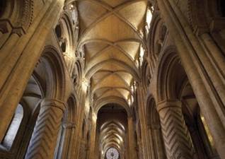 Catedral de Lincoln, Inglaterra Arte Gótica – a Arquitectura - Características Verticalismo: O verticalismo das edificações góticas enfatiza as transformações dos ideais estéticos, do gosto e do pensamento filosófico da época traduzidos no plano arquitectónico. Os mestres góticos desenvolveram técnicas, com o conhecimento das leis mecanicas e da resistência dos materiais, que permitiam cada vez mais a verticalização das construções (as flechas da Catedral de Estrasburgo chegam a 142 metros). Tais construções foram possíveis devido à utilização de abóbadas sustentadas por cruzarias ogivais e do arco quebrado em vez do arco de volta perfeita, além do emprego do arcobotante e dos contrafortes. Arco de Ogiva: Também conhecido como “arco quebrado”, é formado por dois arcos de círculo que se cortam em ângulo agudo. É o principal elemento da arquitectura gótica.