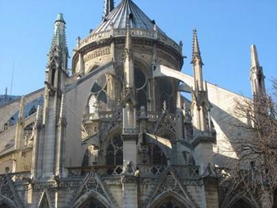 Contrafortes e os Arcobotantes: Os arcobotantes (arcos com a abertura de um quarto de círculo) têm uma função estática definida: eles recebem pressões laterais das abóbadas de cruzaria ogival, descarregam-na sobre os contrafortes (estruturas de sustentação dispostas na parte de fora das paredes exteriores da catedral), e daí, para o chão. São destacados do corpo do edifício e vão até os pilares de sustentação externa, ou seja, aos contrafortes que têm finalidade de reforçar as paredes e de contrariar a pressão descarregada sobre eles.