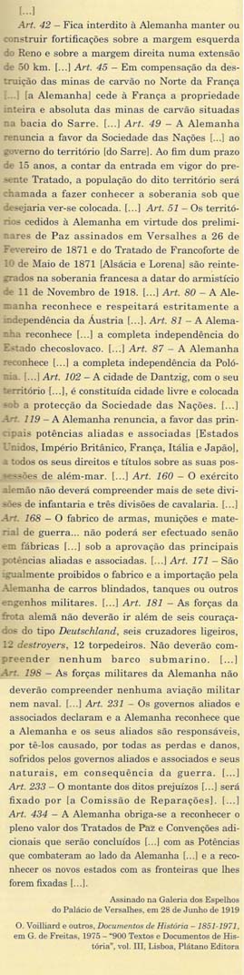 Estrutura do Tratado de Versalhes Parte I Pacto da Sociedade das Nações (artigos 1 a 26 e anexo); Parte II As fronteiras da Alemanha (artigos 27 a 30); Parte III Cláusulas para a Europa (artigos 31 a 117 e anexos); Parte IV Direitos e interesses alemães fora da Alemanha (artigos 118 a 158 e anexos); Parte V Cláusulas militares, navais e aéreas (artigos 159 a 213); Parte VI Prisioneiros de guerra e cemitérios (artigos 214 a 226); Parte VII Sanciones (artigos 227 a 230); Parte VIII Reparações (artigos 231 a 247 e anexos); Parte IX Cláusulas financeiras (artigos 248 a 263); Parte X Cláusulas económicas (artigos 264 a 312); Parte XI Navegação aérea (artigos 313 a 320 e anexos); Parte XII Portos, vias marinhas e vias-férreas (artigos 321 a 286); Parte XIII Organização Nacional do Trabalho (artigos 387 399); Procedimentos (artigos 400 a 427 e anexo); Parte XIV Garantias (artigos 421 a 433); Parte V Previsões e diversos (artigos 434 a 440).