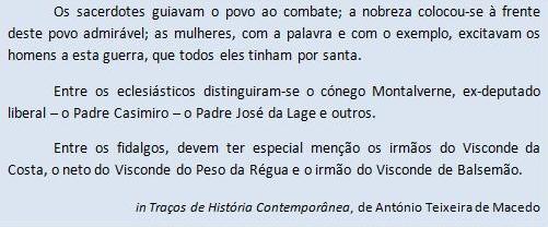 | O presente projecto realizado no âmbito da disciplina de História A tem como tema a «Guerra Civil Portuguesa de 1846 – 1847: a Revolta da “Maria da Fonte”». Com este trabalho, proponho-me a abordar este assunto de uma forma aprofundada, de modo a melhor elucidar os meus conhecimentos referentes ao mesmo, tratando, de uma forma pormenorizada, a rebelião das mulheres do Norte. Portanto, penso que é importante referir as causas da mesma, em que circunstâncias se desenrolou e como foi combatida. Através de documentos, tentarei “dar um rosto” às personagens que caracterizaram esta fase da nossa história, para tornar o trabalho menos monótono. A metodologia utilizada na realização deste trabalho foi, essencialmente, a pesquisa bibliográfica, com utilização de suporte digital online. A partir de 1842 foi instaurado em Portugal o regime Cabralista. Um regime despótico, liderado por António Bernardo da Costa Cabral [Doc.1] (apoiado pelo seu irmão José Bernardo da Silva Cabral – daí a alcunha popular de governo dos Cabrais ou Cabralismo). Costa Cabral impulsionou reformas revolucionárias, na tentativa de tornar o Estado mais moderno. Assim, com objectivos modernistas, promoveu leis que desfavoreciam os privilegiados e que alteraram hábitos anacrónicos. E, sobretudo, porque era necessária uma reorganização fiscal e os impostos aumentavam, Costa Cabral foi obrigado a promover medidas de alteração da estrutura fiscal, com a introdução da contribuição predial. Contra estas medidas insurgiram-se, espontânea e violentamente, a população rural. Este governo reformista não era, de todo, do agrado dos miguelistas, inimigos da implantação do liberalismo. O descontentamento cresceu rapidamente, despertando nos absolutistas os sentimentos das guerras liberais passadas. Os absolutistas, com a ajuda dos seus partidários, alimentaram e beneficiaram do descontentamento popular, com vista à restauração do absolutismo régio. Nas zonas rurais mais distantes e sujeitas a maior consciência religiosa, sobretudo no Alto Minho e em Trás-os-Montes, o povo era influenciado por agentes antiliberais. Na verdade, a guerra civil entre liberais e miguelistas, apesar de oficialmente terminada a 26 de Maio de 1834, com a assinatura da Convenção de Évora-Monte, continuava a dividir os portugueses. Vivendo-se assim um ambiente de contestação, o aparecimento de novas exigências fiscais, o recenseamento da propriedade e a criação de matrizes prediais, significativamente chamadas pelo povo de as papeletas da ladroeira, para apuramento do imposto e um maior rigor no recrutamento militar levaram à saturação da população. No entanto, a última gota de água para gerar a tempestade foi, aparentemente, uma questão de pouca importância: um decreto (Lei da Saúde Pública) de 28 de Setembro de 1844, proibia os enterros nas igrejas e impõe o depósito dos restos mortais dos falecidos, depois de registo do óbito e obtida licença sanitária, em cemitérios construídos em campo aberto. Por via da nova regulamentação dos serviços de saúde, o povo teria de alterar a tradição multissecular de enterrar os defuntos nas igrejas, esperar o certificado de óbito e, ainda, pagar as despesas do funeral. Inicialmente, a lei não foi cumprida, pois existiam muito poucos cemitérios (apesar da lei das taxas e da construção de cemitérios datar de 21 de Setembro de 1835, nunca fora cumprida dada a pobreza em que se vivia na época, agravada pela crise económica resultante da guerra civil e pela praga da batata e a seca que tinham assolado o país durante boa parte da década anterior). Contudo, quando as autoridades decidiram impor as novas regras de enterramento, o povo, empolgado pelo ressentimento acumulado, insurgiu-se violentamente contra o que considerava ser uma prepotência dos políticos liberais. O próprio Clero, mais conservador, falava da lei da proibição dos enterros nas igrejas como antirreligiosa e como sendo obra do diabo e da Maçonaria. Para complicar a situação, a rainha D. Maria II [Doc.2], que a 8 de Setembro de 1845 tinha concedido o título de conde de Tomar a Costa Cabral, era vista como demasiado próxima dos Cabrais, não mantendo um distanciamento que permitisse resguardar a monarquia do descontentamento popular.   Doc. 1 – Costa Cabral e D. Maria II Maria da Fonte  Doc 2 – Excerto da obra “Traços de História Contemporânea”, de António Teixeira de Macedo, referente à revolta da Maria da Fonte. Maria da Fonte é o nome por que ficou conhecida a rebelião que, em Abril de 1846, deflagrou no termo de Vieira do Minho e a que teria dado origem uma rebelião de camponesas rudes e analfabetas, chefiadas por uma moça conhecida por Maria da Fonte [Doc.4], por ser natural da freguesia de Fonte Arcada, do concelho da Póvoa de Lanhoso. É de crer que alguém sentisse interesse em impulsionar as gentes das aldeias a protestar contra tal disposição legal, sabido como os camponeses e os serranos são de grande credulidade e em tudo o que não se coadune com os velhos hábitos veem «pecado». Espontaneamente, ou não, o facto é que as mulheres minhotas alvoroçaram-se pela primeira vez em 19 de Março, na aldeia de Santo André de Frades, concelho da Póvoa de Lanhoso, e, armadas de chuços e foices roçadouras, obrigaram o pároco a sepultar na igreja paroquial uma mulher morta pouco antes. Durante esse mês, repetiram-se estes casos, o que levou o administrador da Póvoa de Lanhoso a prender três mulheres da Fonte de Arcada, as quais forma depois soltas no caminho por outras que entretanto apareceram e puseram em fuga os cabos de ordens.  Doc 3 – A Maria da Fonte (1846), aguarela de Roque Gameiro Até meados de Abril, repetiram-se estes actos de protesto, mas então eles voltam-se contra os funcionários da Fazenda, que andavam a proceder a inquéritos quanto aos bens que cada um devia manifestar para efeitos do lançamento de impost