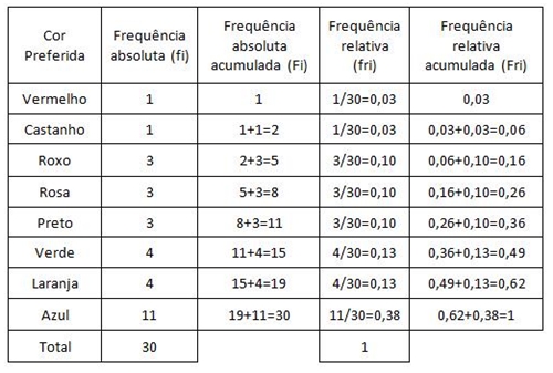 Interpretação dos dados estatísticos: . A população dos dados estatísticos é a população portuguesa de Lisboa. . A amostra é as trinta pessoas a quem perguntamos a respectiva por favorita. . A unidade estatística é cada pessoa a quem fizemos o estudo estatístico. . A variável estatística é qualitativa. Tabela de frequências: