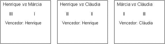 Contagem O sistema preferencial, na contagem dos votos, subdivide-se em dois métodos: o de Borda, e o de Condorcet. Tomemos como exemplo a seguinte situação: Numa eleição para o delegado de turma, candidatou-se a Márcia (M), a Cláudia (C), o Henrique (H) e a Sandra (S).