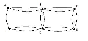 Este grafo tem dois vértices de grau ímpar, logo não seria possível efectuar um circuito de Euler. No entanto, o percurso mais curto, em que o Pai Natal só teria de percorrer duas vezes uma rua, é o seguinte: