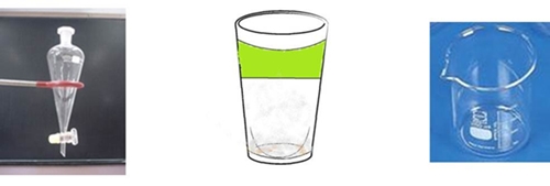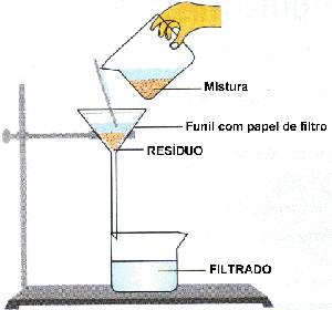 Procedimento experimental: 1º - Montou-se o suporte universal e encaixou-se a ampola de decantação na garra; 2º - Colocou-se o azeite e a água na ampola e a água caiu sucessivamente no gobelé vazio. O facto de o azeite ficar acima da água deve-se a este ser menos denso que a água. (imagem 1); 3º - A água escorreu no gobelé, misturou-se a areia e assim mexeu-se até se obter água turva. (imagem 2); 4º - Retirou-se a ampola do suporte universal e encaixou-se as argolas para funil adaptadas ao suporte. Depois colocou-se o funil de vidro nas argolas; (imagem 3); 5º - Dobrou-se o papel ficando com uma forma de um filtro. Esse papel reteve a terra deixando passar a água límpida; (imagem 4); 6º - A água límpida ficou depositada no gobelé e a areia no filtro de papel. Observação e registos: