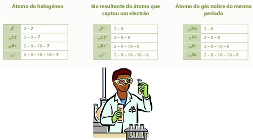 Os átomos dos halogéneos transformam-se facilmente em iões mononegativos, pois, ao captarem um electrão, adquirem uma nuvem electrónica mais estável, semelhante à do gás nobre do mesmo período.