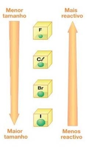 Qual é o halogénio mais reactivo? A facilidade que os átomos dos halogéneos têm para se transformarem em iões mononegativos é tanto maior quanto menor for o seu tamanho. . os átomos de flúor, que são os mais pequenos, captam mais facilmente um electrão transformando-se com maior facilidade em iões mononegativos por isso, o flúor é o halogéneo mais reactivo; . os átomos de iodo, que são os maiores, captam menos facilmente um electrão transformando-se com menos facilidade em iões mononegativos o iodo é, por isso, o menos reactivo dos quatro halogéneos.