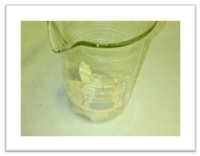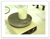 3. Deitámos, ambos os reagentes antes medidos, para um copo de precipitação de 250cm3; 4. Aquecemos a cerca de 200ºC durante 14 minutos, agitando sempre com a vareta de vidro até se formarem grumos; Atenção: não deixar a mistura ferver.