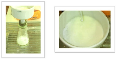 8. Com o auxílio de duas pinças de mora, retramos o sólido obtido (com o filtro de papel); 9. Colocámos o sólido numa caixa de petri e colocámos outro filtro por cima do sólido, precionando cuidadosamente, com a intenção de remover o excesso de líquido;
