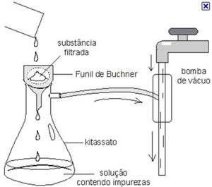 O material de destilação em posição se ser utilizado. (Foto tirada após p fim do processo de destilação) Conclusão - O processo de filtração foi bem sucedida, pois todos os extractos de terra presentes na solução ficaram retidos dentro do filtro, ficando assim dentro do kitasato apenas água com sal dissolvido. - Ficando assim como o primeiro passo para a concretização dos objectivos da actividade, pois tinha-se agora o primeiro elemento separado dos outros, a terra. - O processo de destilação também foi bem sucedido pois, mesmo tendo sido um sucesso a obtenção do sal no estado sólido, nem toda a água que se tinha inicialmente ficou contida dentro do balão de Erlenmeyer, devido a falhas no isolamento dos materiais. No entanto nenhuma das 3 substâncias ficou com vestígios de outra substancia. - Ficando assim concluída a actividade, tendo-se as 3 substâncias iniciais separadas. - Conclui-se então que os objectivos foram cumpridos, conseguindo-se separar as 3 substâncias, executar com êxito os processos de separação de misturas e aumentar a experiencia no trabalho de laboratório e em grupo. Criticas dos resultados - A água utilizada na actividade era água da torneira. - Apenas se encontravam á disposição 2 funis de Büchner para 4 grupos de trabalho. - Apenas se encontrava uma á disposição uma bomba de vácuo para 4 grupos de trabalho. - Na destilação existiam fendas entre o termómetro e o balão, que mesmo isoladas com fita cola permitiam alguma saída de vapor de água. - Quando o termómetro marcava os 112° o tubo de borracha que ligava a fonte de água ao condensador de tudo recto de Liebig soltou-se e a destilação teve se ser interrompida. Bibliografia - Química em contexto 10ºano, Porto Editora, SIMÕES Teresa, QUEIRÓS Maria, SIMÕES Maria, 1ºedição. - www.wikipedia.com - http://www.qmc.ufsc.br/qmc5230/aula02/destsimples.html