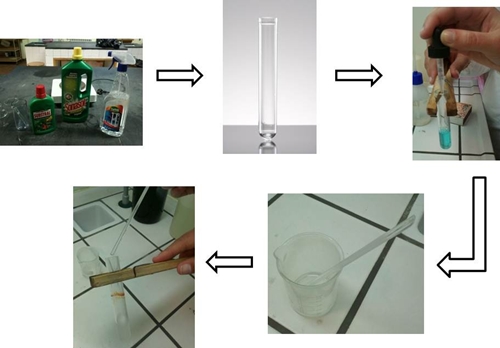 1.ª Experiência . Tubos de ensaio; . Suporte para os tubos de ensaio; . Pinça de madeira; . Vareta de vidro; . Vidro de relógio; . Pipeta de Pasteur; . Garrafa de esguicho; . Conta-gotas; . Lamparina . Fósforos . Gobelé de 150 ml.