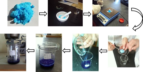 Síntese do sulfato de Tetraminocobre (II) Mono-Hidratado - Esta experiência teve duas etapas devido ao facto de a mistura, constituída pela solução de amoníaco e os cristais pulverizados de sulfato de cobre (II) penta-hidratado, ter de repousar até à aula seguinte. Na 1.ª etapa realizamos o seguinte: