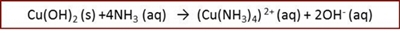 Em seguida, o amoníaco reage com o Cu(OH)2 originando Cu(NH3)4, que tem uma cor azul intensa: