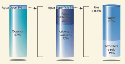 A água A água é um líquido incolor e inodoro, formada por dois átomos de hidrogénio (H2) e por um átomo de oxigénio (O) - molécula H2O. É uma substância abundante na Terra, cobrindo cerca de 2/4 da superfície do planeta, sendo encontrada principalmente nos oceanos e calotes polares, nos continentes em rios, lagos, glaciares e aquíferos e também na atmosfera sob a forma de nuvens, para além da que está contida em todos os organismos vivos. Esta encontra-se na natureza, simultaneamente, em três estados físicos: - no estado líquido, (oceanos, lagos e rios); - no estado sólido (glaciares); - no estado gasoso (nuvens).