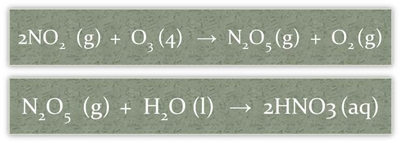 O dióxido de nitrogênio (NO2) reage com o ozono, oxidante encontrado na atmosfera, formando o pentóxido de dinitrogênio (N2O5) que gera o ácido nítrico: