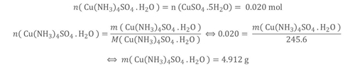 Síntese de sulfato de tetraaminocobre (II) mono-hidratado: Cu(NH3)4SO4 . H2O Objectivo: A síntese do sal complexo sulfato de tetraaminocobre (II) mono-hidratado é o objectivo desta actividade prático-laboratorial. Material/ equipamento: O material/equipamento utilizado para a realização desta experiência foi: . Almofariz com mão . Balança semianalítica . 1 copo de 50 mL . 1 copo de 250 mL . Equipamento para filtração a pressão reduzida . Papel de filtro . Película aderente . Duas provetas de 10mL . Vareta . Vidro de relógio . Hotte Registo de resultados/registo de observações: Os resultados a registar são relativos a medições de massa e volume realizados: . Massa do sulfato de cobre penta-hidratado (CuSO4 . 5H2O) = 4,99g * . Massa de papel de filtro = 0,29g . Massa de papel de filtro + cristais = 4,86g . Volume de H2O = 5,O mL . Volume de álcool etílico = 10, 0 mL + 2 x ( 2 a 5 mL) ** . Volume de NH3 = 8.0 m * Sabe-se a massa de sulfato de cobre penta-hidratado através do cálculo da mesma uma vez que nos foi fornecido no protocolo o número de moles de sulfato de cobre penta-hidratado. ** 2x (2 a 5mL) é referente à adição de álcool etílico para lavagem dos cristais Cálculos: Cálculo da massa de sulfato de cobre penta-hidratdo (CuSO4 . 5H2O) n (CuSO4 . 5H2O) = 0.020 mol