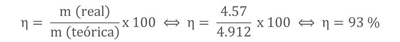 Cálculo da massa real do produto (os cristais formados): m real = m (papel de filtro + cristais) – m (papel de filtro) = 4.86 - 0.29 = 4.57 g Cálculo do rendimento da reacção :