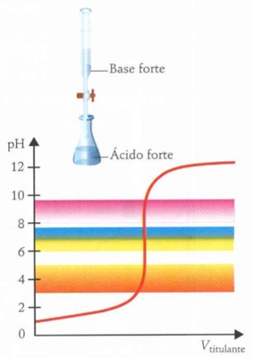 No nosso caso tanto a base como o ácido eram fortes. O nosso ácido era o HCl e era o titulante que utilizamos 50 ml, por sua vez a nossa base era o NaOH que utilizamos 20ml e deste foi-nos dada a concentração que era c=1,5mol/ cm3. Como esta actividade queríamos determinar a concentração do titulante/ácido que não sabíamos, com este pretexto visualizamos na bureta o volume antes de começar a titulação e no final, com isto retiramos os seguintes valores: . Vtitulante (inicial) = 36 ml . Vtitulante (final) = 27mL . V(gasto) = 9ml A partir destes dados e com a seguinte expressão: C(ácido) x V(ácido)=C(base) x V(base) , nesta expressão excluímos o n(moles) uma vez que deve ser igual para que esta titulação se realize, assim sendo passaremos a apresentar os cálculos que nos levaram à concentração (c) do titulante/ácido C(ácido) x V(ácido)=C(base) x V(base)«=» «= »C(ácido) x 50 = 1,5 x 9 «=» «=» C (ácido) = 13.5/ 50 «=» «=» C (ácida) = 0,27 mol/ dm3 Na imagem seguinte a cor carmim (cor-de-rosa), é a zona de viragem da fenolftaleína, o indicar de pH que utilizamos.
