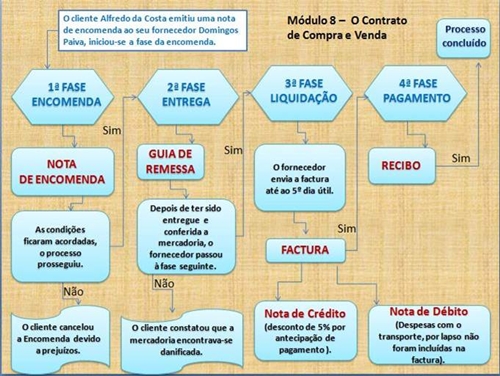 É a descrição de uma dívida e uma indicação do que deve pagar. Permite controlar, antes do pagamento, se o montante reclamado é exato e justificado, nomeadamente se corresponde ao orçamento anteriormente estabelecido, se a taxa do IVA aplicada é a correta, etc. Pode igualmente ser uma prova de compra para o consumidor na hipótese de não se terem efetuado nem um orçamento, nem uma nota de encomenda. O que deve constar de uma factura? . Data e número sequencial; . Identificação do vendedor ou prestador de serviços (nome, firma ou denominação social, morada da sede ou domicílio); . Identificação do consumidor; . Identificação fiscal do profissional e do consumidor; . A quantidade e denominação usual dos bens ou serviços, com especificação dos elementos necessários à determinação da taxa de imposto aplicável; O preço líquido antes do imposto; . As taxas aplicáveis e o montante do imposto devido (IVA); . O motivo justificativo da não aplicação do imposto, se for caso disso. A fatura eletrónica é um documento comercial semelhante à versão em papel, mas distribuído em ficheiro informático. Tem a mesma validade das facturas em papel desde que haja acordo prévio entre as empresas envolvidas na troca digital de informação, seja garantida a autenticidade da origem e a integridade do conteúdo através de uma assinatura digital ou EDI (electronic data interchange), e o arquivo em suporte eletrónico preste acesso on-line à Administração Fiscal e assegure a integridade da origem e do conteúdo durante o prazo legal, fixado em dez anos. A Recibo Recibo vem do verbo receber, é a declaração escrita de ter comprado ou recebido alguma coisa, documento comprovativo. O recibo de compra é muito importante pois funciona como um comprovante de que adquirimos o produto. Em caso de qualquer problema, devemos apresentá-lo possibilitando assim hipótese de defesa do consumidor. A nota de encomenda é o documento escrito no qual o vendedor e o consumidor registam o seu acordo sobre o objeto e o preço da venda, quando o consumidor não pode levar imediatamente o bem comprado. A nota de encomenda pode ou não ser assinada pelo consumidor, mas em ambos os casos pode constituir um contrato. Logo que haja acordo as partes estão, em princípio, obrigadas a concretizar a compra e venda, no sentido jurídico deste termo. O facto do pagamento e da entrega ocorrerem mais tarde não altera nada, especialmente na chamada compra e venda tradicional. Portanto, a nota de encomenda é uma prova de promessa de compra e venda. Na generalidade, a legislação não prevê a possibilidade de anular a nota de encomenda salvo em determinadas modalidades de venda ou quando o consumidor e vendedor estabelecerem condições para essa anulação. A Nota de Crédito é um documento comercial emitido por um vendedor a um comprador. Ela indica quantidades, preços e formas de pagamento (dentre outros) acordados entre vendedor e o comprador para produtos e/ou serviço, cujo comprador não pagou, não recebeu, ou devolveu. A Nota de Crédito pode também ser emitida no caso de mercadorias danificadas, erros ou reajustes. Uma Nota de Crédito pode reduzir ou eliminar o montante que o comprador tem de pagar ao vendedor, em relação ao original da factura emitida anteriormente. A Nota de Crédito geralmente contém: Código, Data, Endereço de facturamento, Endereço de Entrega, Condições de Pagamento, Lista de Produtos com preços e quantidades. Normalmente ela também referências a factura original e pode estar especificada a razão de sua emissão. O vendedor geralmente emite uma Nota de Crédito para igual ou menor valor do que a factura original, em seguida, reembolsa o dinheiro ao comprador ou abate este Crédito de um saldo devedor de outras possíveis transações do mesmo comprador. Nota de débito é uma nota muito utilizada para se efectuar, por exemplo, cobrança de valores para os quais não seja compatível a emissão de nota fiscal. A nota de débito diz que o seu sacado é devedor do sacador. Uma de suas utilizações práticas é para a cobrança de encargos referentes a duplicatas e outros títulos que tenham sido pagos em cartório. Cabe ressaltar que a nota de débito não é título de crédito, não sendo passível de protesto, tampouco de ação judicial de execução de dívida. Através da emissão de uma nota de débito, pondera-se debitar-se um determinado valor monetário a um cliente. Esta operação originará um acréscimo da dívida desse cliente (sendo devedor) ou uma diminuição do seu crédito (sendo credor). A nota de débito é utilizada frequentemente para debitar encargos por conta do cliente, despesas com serviços bancários, juros, taxas, etc.