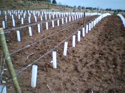 Figura 3. Sistema de Rega gota-a-gota construído acima do nível do solo( in Plantalegre, Produção e Comércio de Plantas,LDA) Um sistema de rega gota-a-gota é um sistema de fácil construção, devido à sua pouca complexidade. Para a construção de um pequeno sistema de rega gota-a-gota manual apenas necessitamos de uma torneira que forneça água às tubagens que contêm pequenos orifícios preenchidos por gotejadores que permitem a saída de água para a planta. Já para um grande sistema de rega gota-a-gota, ou seja para um sistema gota-a-gota que abranja uma extensa área e que exija consequentemente uma maior complexidade de construção. Para uma construção desta envergadura para além de muitos metros de tubo e de muitos gotejadores é também necessário um motor-bomba para puder fornecer água a todo o sistema, um programador electrónico, válvulas e no caso de se tratar de uma construção moderna também terá um sensor de humidade, um sensor de chuva e um sensor de vento e gelo.