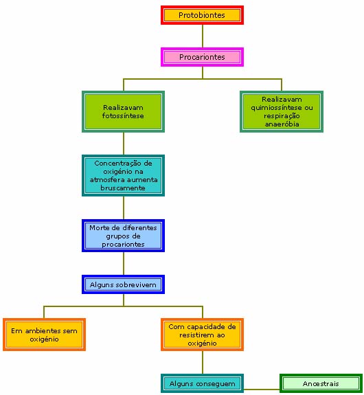 Protobiontes: agregados moleculares incapazes de se reproduzirem de forma regular, mantinham um certo equilíbrio interno e reagiam a certos estímulos do meio Procariontes: células rudimentares sem núcleo organizado Eucariontes: células mais complexas com diversos organelos e núcleo organizado e individualizado