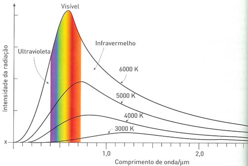 Qualquer que seja a temperatura a que se encontrem, os corpos emitem radiações em todas as frequências. No entanto, existe uma zona em que emitem com intensidade máxima. Esta zona não é sempre a mesma: desloca-se para maiores frequências (menores comprimentos de onda) à medida que a temperatura aumenta. As estrelas apresentam cores diferentes conforme a temperatura a que se encontram.