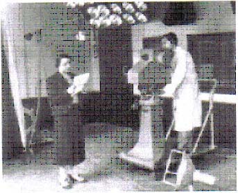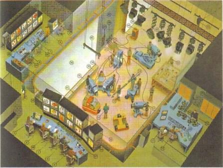 A transmissão de um programa ao vivo exige a participação de uma equipe numerosa e altamente qualificada que se pode dividir em quatro grupos: pessoal da cena, controle de cor e iluminação, controle de som e direcção. Todos figuram nesse esquema de um estúdio actual. Legenda: 1- Director 2- Director-assistente 3- Trucagens 4- Director-técnico 5- Marcador de tempo 6- Supervisor de iluminação 7- Controle de regulagem das câmaras 8- Engenheiro de iluminação 9- Graduador de som 10-12- Engenheiros de som 13- Director de cena 14- Apresentador 15-18- Cameramen 19- Operador de microfone 20- Operador de monitor 21- Controle de cena 22- Acessorista 23-24- Electricistas 25- Receptor de director 26- Microfone para o estúdio 27- Tela de teste 28- Regulador da luz 29- Quadro comutador 30- Controlo de diafragma de imagem 31- Mostruário de luz 32- Controlo de qualidade de imagem 33- Mesa de som 34- Magnetoscópios 35- Amplificadores 36- Ciclorama 37- Painel de controlo dos guinchos 38- Encaixe de saída 39- Spotlight 40- Projectores 41- Luzes de ciclorama 42- Guinchos do cenário 43- Parede à prova de som 44- Locutor de estúdio 45- Telecinema 46- Imagem de vídeo-teipe 47- Imagem final monocrómica 48- Imagem final a cores 49- Monitor geral 50- Créditos 51-54- Imagem das câmaras 55- Monitor de câmaras extras e transmissões externas
