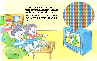 Início das transmissões em cores As transmissões regulares a cores nos E.U.A., começaram em 1954. Mas já em 1929, Hebert Eugene Ives realizou, em Nova Iorque, as primeiras imagens coloridas com 50 linhas de definição por fio, cerca de 18 frames por segundo. Peter Goldmark aperfeiçoou o invento mecânico fazendo demonstrações com 343 linhas, a 20 frames por segundo, em 1940. Vários sistemas foram criados, mas todos iam de encontro a uma forte barreira: se um sistema novo surgisse, o que fazer com os aparelhos antigos a preto e branco que já eram cerca de 10 milhões no início dos anos 50? Criou-se nos Estados Unidos um comité especial para, no sentido literal, colocar cor no sistema preto e branco. Esse comité recebeu o nome de National Television System Committee (também conhecido como National Television Standards Committee), cujas iniciais serviam para dar nome ao novo sistema, NTSC. O sistema desenvolvido baseava-se em utilizar o padrão a preto e branco que trabalhava com níveis de luminância (Y) e acrescentaram a cronomância (C), ou seja a cor. O princípio de captar e receber as imagens em cores está na decomposição da luz branca em três cores primárias que são o vermelho (R de red), o verde (G de green) e o azul (B de blue). Numa proporção de níveis de 30% de R, 59% de G e 11% de B. Na recepção o processo é inverso, a imagem compõem-se através da somatórias das cores de pixel, ou seja, nos pontos da tela do televisor.