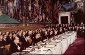 Fig.1: Assinatura do tratado de Roma O Tratado de Roma de 25 de Março de 1957, que institui a CEE, cria instruções e mecanismos de tomada de decisão que permitem dar expressão tanto aos interesses nacionais como a uma visão comunitária. A Comunidade Europeia constitui doravante o eixo principal em torno do qual se vai organizar a construção europeia. De 1958 a 1970, a abolição dos direitos aduaneiros tem repercussões espectaculares: o comércio intracomunitário é multiplicado por seis, ao passo que as trocas comerciais da CEE com o resto do mundo são multiplicadas por três. No mesmo período, o produto nacional bruto médio da CEE aumenta 70%. Seguindo o padrão dos grandes mercados continentais, como o dos Estados Unidos da América, os agentes económicos europeus sabem tirar proveito da dinamização resultante da abertura das fronteiras. Os consumidores habituam-se a que lhes seja proposta uma gama cada vez mais variada de produtos importados. A dimensão europeia torna-se uma realidade. Em 1986, a assinatura do Acto Único permitirá abolir as outras restrições, de ordem regulamentar e fiscal, que atrasavam ainda a criação de um mercado interno genuíno, totalmente unificado. 20 De Julho de 1963: Iaundé, os primórdios de um papel internacional Com os seus destinos a unirem-se no continente, os Estados fundadores da Comunidade Europeia assinam com as suas antigas colónias africanas, em 1963, uma convenção que garante a estas últimas certas vantagens comerciais e ajudas financeiras. A Convenção de Lomé, que se seguiu à de Iaundé, aplica-se actualmente a 70 países da África, das Caraíbas e do Pacífico, tornando a União Europeia a maior fonte de ajuda pública ao desenvolvimento. A cooperação estendeu-se igualmente, sob outras formas, à maior parte dos países da Ásia e da América Latina. Em 28 de Novembro de 1995, os 15 países da União Europeia e 12 países do sul do Mediterrâneo estabelecem uma parceria que deverá conduzir à criação de uma zona de comércio livre, combinada com acordos de cooperação nos domínios social, cultural e humano. No século XXI assistir-se-á à afirmação da Europa como potência de paz, desde que a União promova a estabilidade e o desenvolvimento nos grandes grupos regionais que a envolvem. Graças ao papel que desempenha nas trocas comerciais mundiais e ao seu peso económico, a União é já um parceiro respeitado nas grandes instâncias internacionais, tais como a Organização Mundial de Comércio ou a ONU. Progressivamente, a União apoia-se no seu potencial económico para desenvolver a sua influência política e afirmar-se com uma só voz. O Tratado da União Europeia, de 1992, fixa o objectivo e as modalidades de uma política externa e de segurança comum (PESC), que inclui, a prazo, a definição de uma política de defesa comum. Mas os europeus deverão ainda envidar numerosos esforços para harmonizar a sua diplomacia e a sua política de segurança. É esse o preço, que pressupõe uma vontade política real dos Estados-membros, para que a União possa defender os seus interesses e contribuir para a criação de um mundo de paz e de justiça.