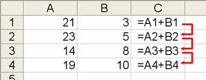 Quando são copiadas células com fórmulas contendo referências a outras células, estas são ajustadas de forma a contemplarem a localização da célula onde é colada a fórmula. Por exemplo, se na célula C1 estiver a fórmula “=A1+B1”, quando esta fórmula é copiada para a célula C2, a fórmula é ajustada para “=A2+B2”; se a mesma fórmula for copiada para a célula C3, a fórmula será ajustada para “=A3+B3”.