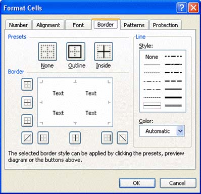 Na opção “Cells” do menu Format é possível aplicar outro tipo de formatações dos limites. Para aceder a essas opções, deverá ser escolhida a opção “Cells” no menu Format (a mesma opção utilizada para a formatação de caracteres) e, na caixa de diálogo que surge de seguida deverá ser escolhido o separador “Border”. As formatações existentes nesta caixa de diálogo são as seguintes: - Cor dos limites: através da escolha da cor pretendida existente na caixa de opções “Color”; - Tipos de limites: através dos botões ou do diagrama disponível na caixa de diálogo (por exemplo, é possível colocar limites à direita das células, à esquerda, no topo, na base, no interior da selecção, no exterior da selecção e ainda no interior das próprias células; - Estilo dos limites: através das opções existentes em “Line Style” é possível escolher diversos tipos de linhas para os limites. De acrescentar que é possível a aplicação de limites com diferentes cores ou com diferentes estilos de linhas à mesma célula.