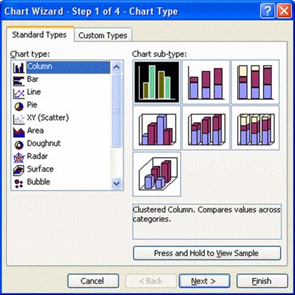 Wizard” No primeiro passo do assistente são dadas diversas opções de tipos e sub-tipos, entre os quais gráficos de colunas e barras, gráficos de linhas, gráficos de linhas com área, gráficos do tipo “tarte” e do tipo “radar” e gráficos com escala XY.