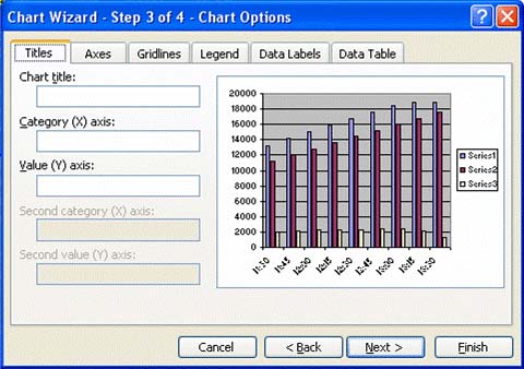 No terceiro passo do assistente (acedido através do botão “Next) são definidas as seguintes características: - os títulos do gráfico e dos eixos das absissas e das ordenadas (separador “Titles”); - algumas características dos eixos tais como a colocação ou não de valores no eixo das ordenadas (separador “Axes”); - a colocação ou não das linhas horizontais e verticais da grelha e respectivas características (separador “Gridlines”), a legenda e respectiva posição (separador “Legend”); - a colocação ou não de etiquetas tais como o nome da série, a categoria ou os próprios valores da série (separador “Data Labels”); - a colocação ou não de uma tabela com os valores do gráfico (separador “Data Table”).