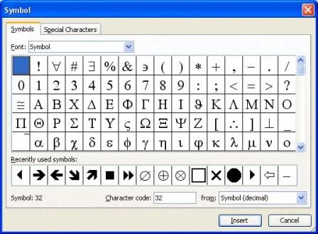 Por vezes existe a necessidade de colocar determinados símbolos nos textos que são colocados nas células e que não estão disponíveis no teclado. Por exemplo, as letras gregas não estão disponíveis no teclado (estão disponíveis escolhendo uma determinada fonte mas não estão visíveis nas teclas, ou são obtidos através de combinação de teclas sendo difícil a sua inserção); contudo é possível facilmente inseri-las recorrendo à opção “Symbol” no menu Insert. Ao ser executada esta opção, é apresentada uma caixa de diálogo com uma variada gama de fontes, cada uma delas com numerosos símbolos. As letras gregas estão disponíveis quando se escolhe a fonte “Symbol”.