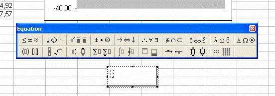 Como exemplo iremos apresentar a construção de uma equação utilizando diversos símbolos matemáticos. O objecto para inserir equações é o “Microsoft Equation 3.0”. Ao ser escolhida esta opção é aberto o editor de equações e é apresentada uma caixa de diálogo, onde é possível escolher os diversos tipos de símbolos para desenhar a equação (por exemplo, o primeiro botão contem os símbolos de maior ou igual, menor ou igual, diferente, aproximadamente, entre outros):